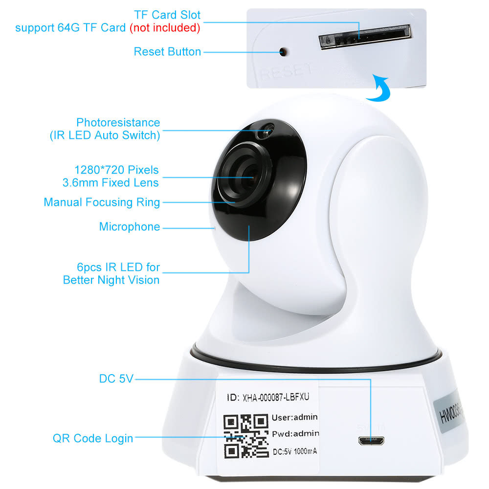 *Support WiFi, TF card record, IR night view, motion detection, email alarm.